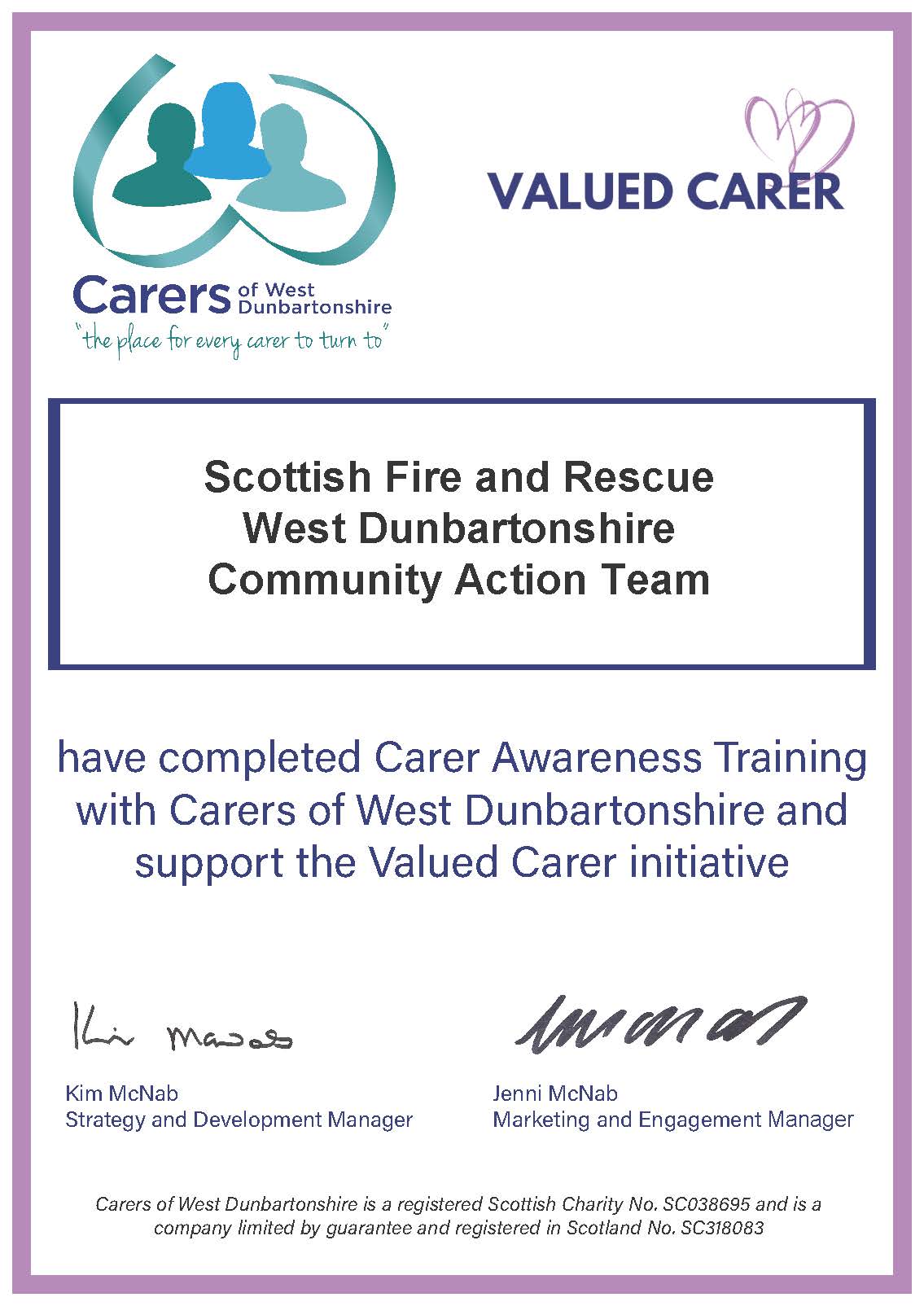 The Scottish Fire and Rescue Community Action Team (West Dunbartonshire) have completed Carer Awareness Training, to better identify and support unpaid carers.